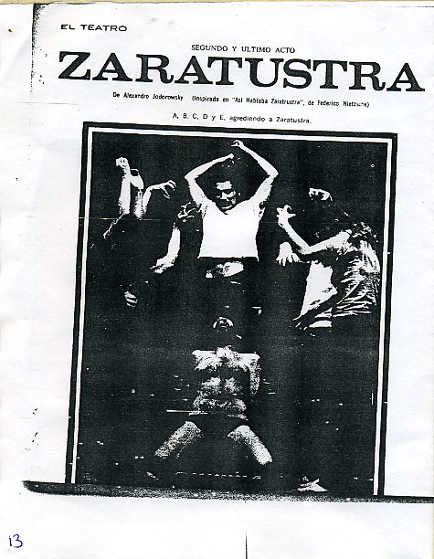 Zarathustra (1970) is an attempt to dramatize the book Thus Spoke Zarathustra by Friedrich Nietzsche. I owe the content of the first act to the German philosopher. In the second act I fly with my own wings.
